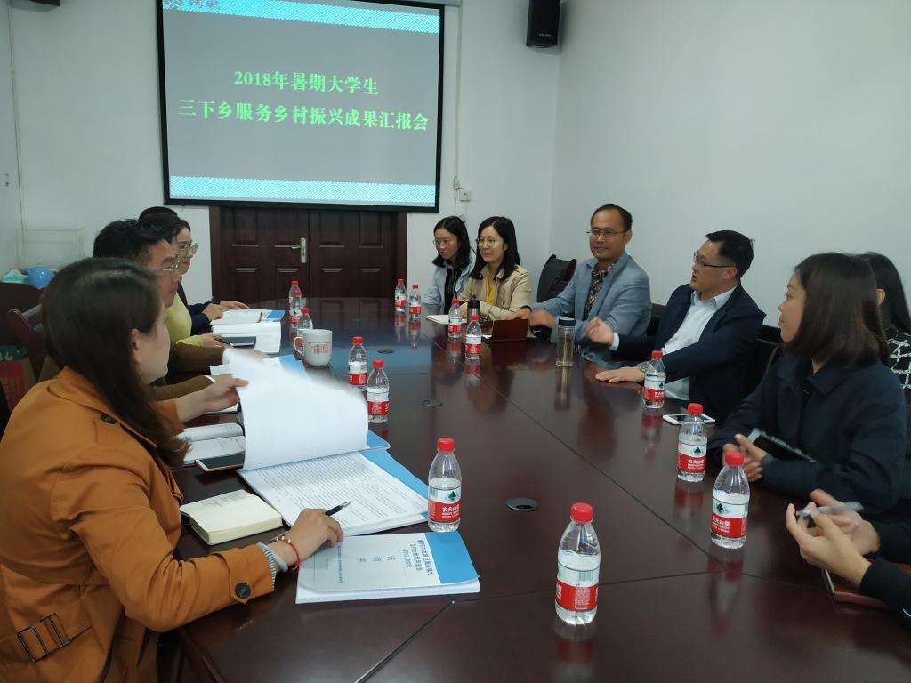 汇报会上,学生代表袁鑫同学详细地汇报了2018年暑期大学生三下乡“服务乡村振兴”成果——九龙村土地规划及村规划。调研前期,志愿服务队通过资料图鉴、卫星遥感影像,在实验室对九龙村进行了预判分析。在镇政府及九龙村委会的支持和帮助下,团队顺利完成了村土地利用规划编制的前期外业工作,开展了村域面上调查和村民入户调查,获得了规划编制的基础资料。调研结束后,根据基础调查分析,从村域产业发展、生态保护、耕地和永久基本农田保护、村庄建设、基础设施和公共设施建设、环境整治等方面编制规划土地规划及村规划。历时两个月,服务队顺利完成了九龙村土地利用规划编制工作成果。