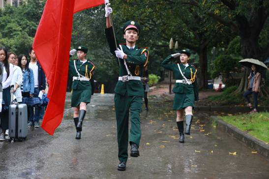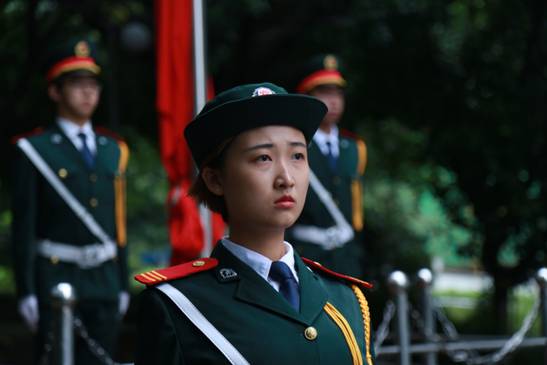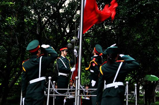 升旗仪式开始,pp电子大自委国旗班的升旗方队迈着铿锵有力的步伐,气宇轩昂地走向升旗台。伴着庄严的国歌声,鲜红的五星红旗在众人的注目礼中冉冉升起。礼毕后,升旗方队整齐肃穆地站在升旗台前,严肃庄重。