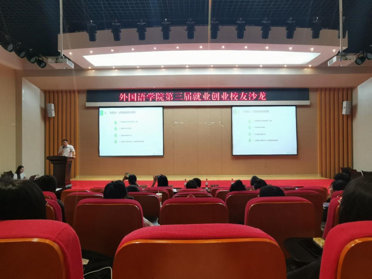 6月11日下午,由外国语学院党员服务站主办的第三届就业创业校友沙龙活动在南岸校区田家炳209报告厅成功召开。重庆新途进出口贸易有限公司董事长、校友会副会长王敬春、重庆锴明泰贸易有限公司董事长刘向金、重庆新途进出口贸易有限公司办公室主任童雯、外国语学院党委书记唐春秋、院长周琳、党委副书记吴欢欢,及师生代表参加了此次活动。
