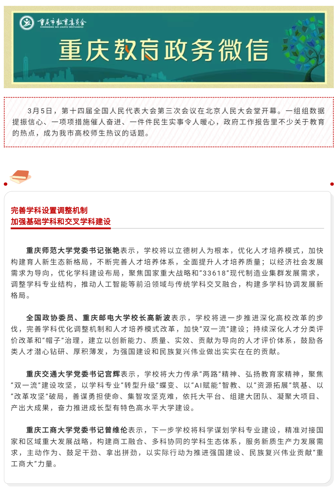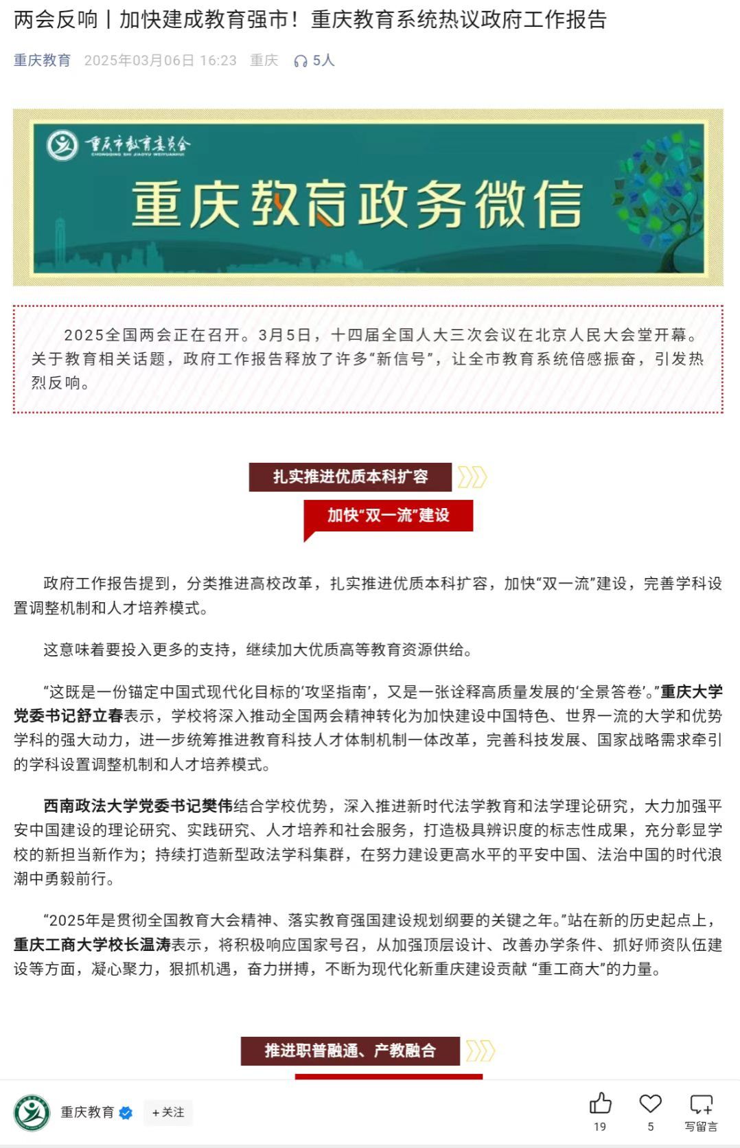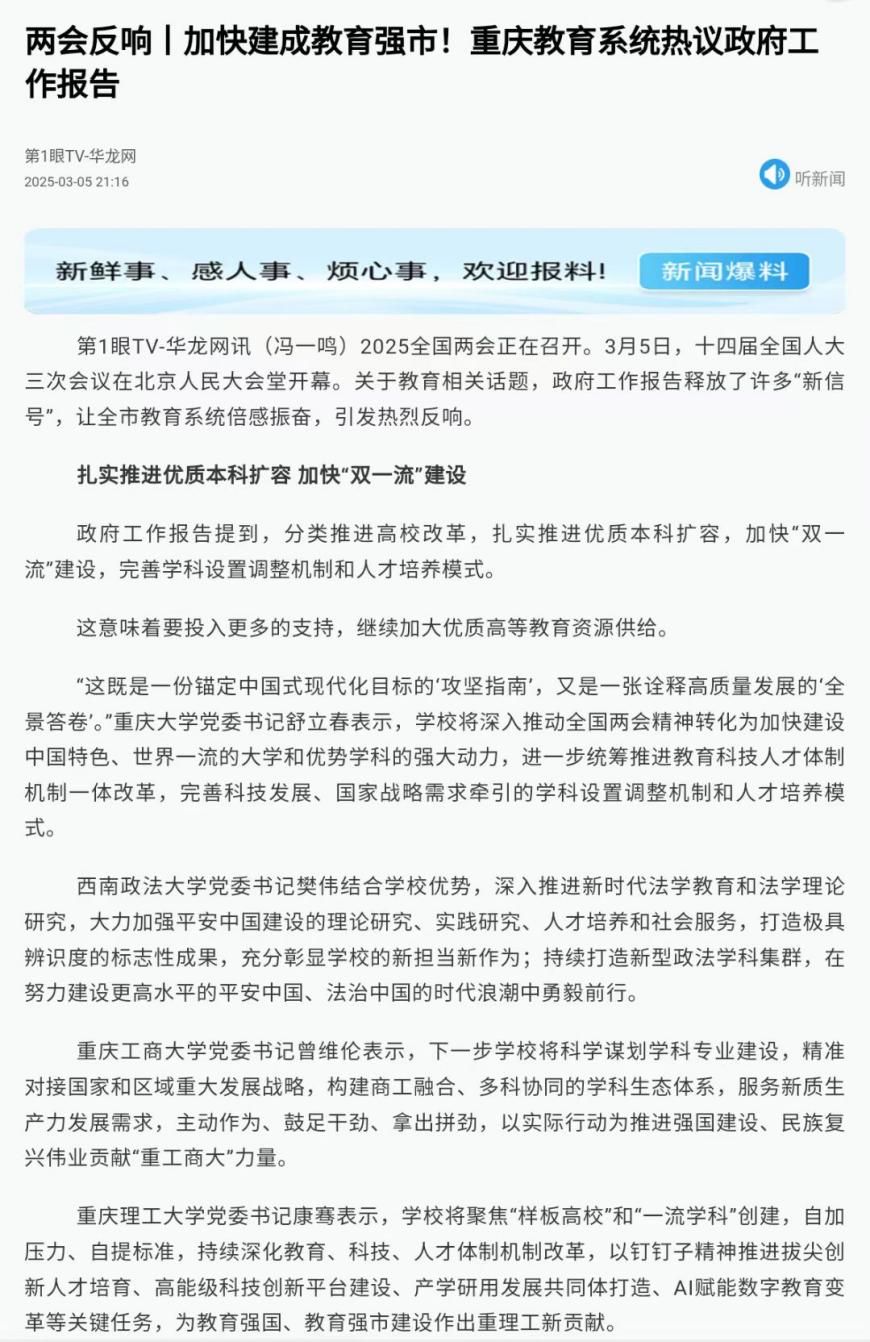 2025全国两会正在召开。3月5日,十四届全国人大三次会议在北京人民大会堂开幕。关于教育相关话题,政府工作报告释放了许多“新信号”,引发pp电子干部师生的高度关注和热烈反响。第一眼TV-华龙网和重庆教育公众号对此进行了报道。